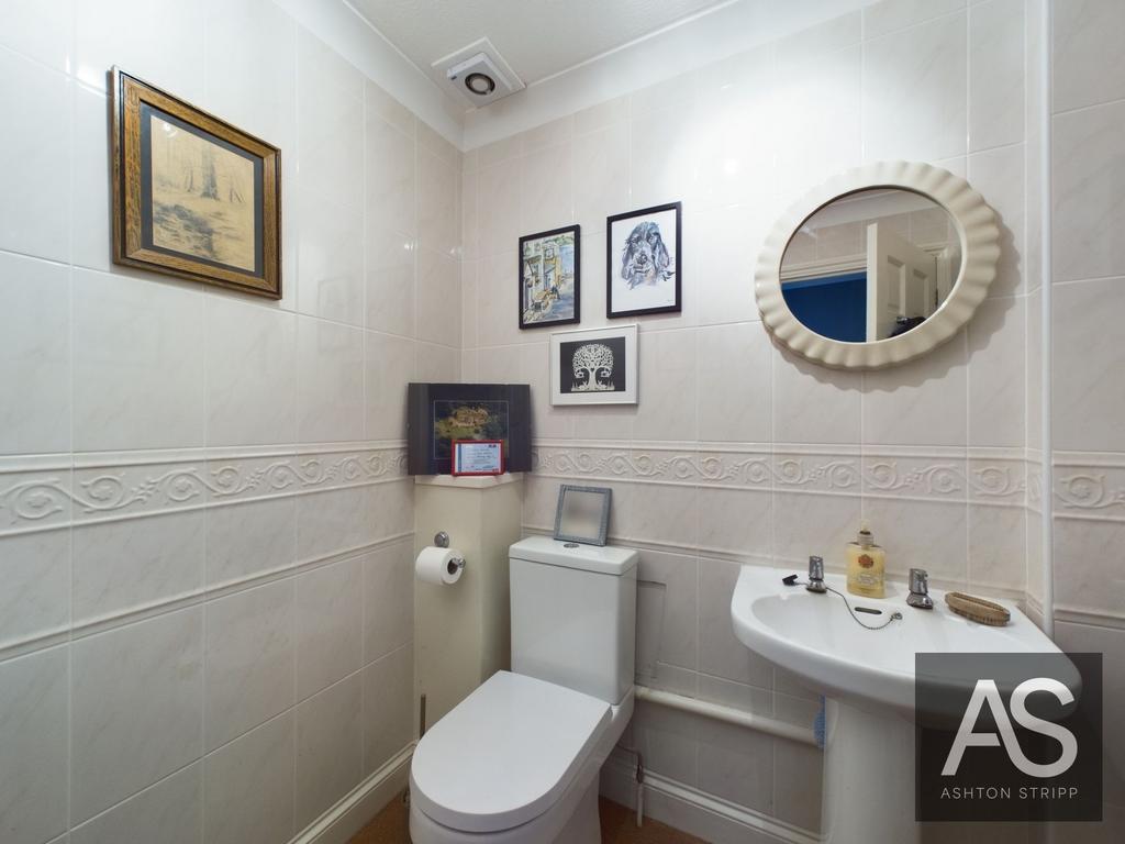 Cloakroom: Fully tiled, featuring a WC, sink, and tiled flooring.