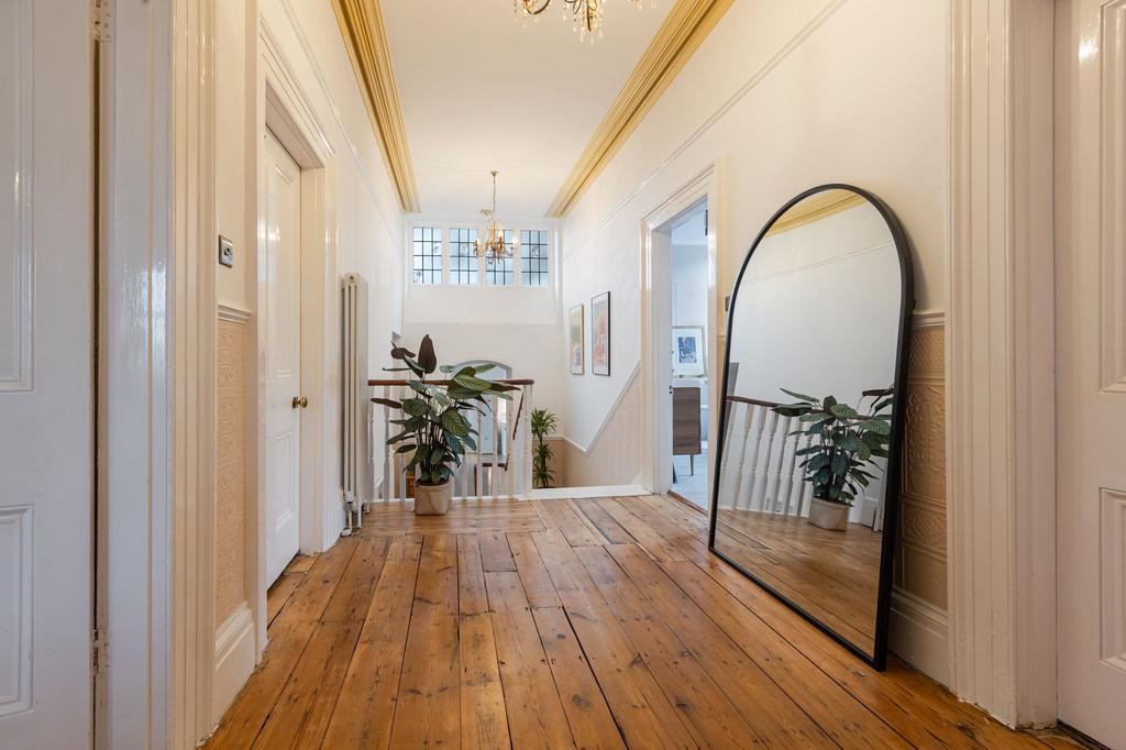 From the Reception Hall a staircase rises to the First Floor Level with high level leaded light windows over the stairway. To the rear wing are 2 DOUBLE BEDROOMS, one with dual aspect and one with an ornate marble fireplace and exposed floorboards. The SHOWER ROOM has been beautifully appointed with low profile shower with body spray and rain head, vanity unit and WC. Utility cupboard with provisions for washing machine and dryer. Off the main landing are four bedrooms with the PRINCIPAL ROOM having an Adam style fireplace with inset log burner, bay window enjoying open views over the surrounding area towards the sea in the distance at Tor Bay and two further windows to the side. BEDROOM 2 is also a generous double with square bay over the dining room. BEDROOMS 3 & 4 are both of generous proportions. FAMILY BATHROOM with slipper bath, double shower, his and hers basins, WC, tiled floor and twin windows.