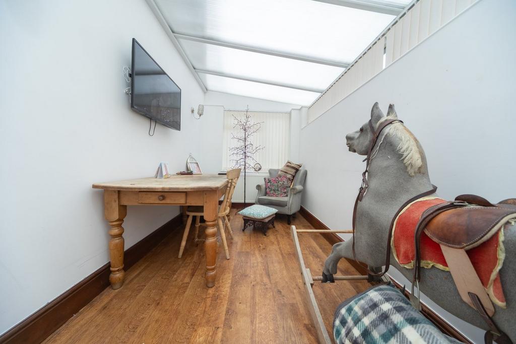4.58m x 2.05m (15' 0" x 6' 9") A useful addition to the side of the house and accessed from the kitchen with french doors to the rear, Upvc window to the front elevation and high level Upvc windows to the side, single pitch roof, wall light points and timber effect flooring.
