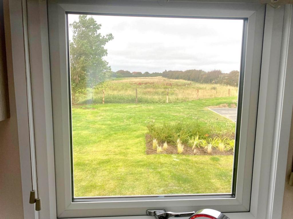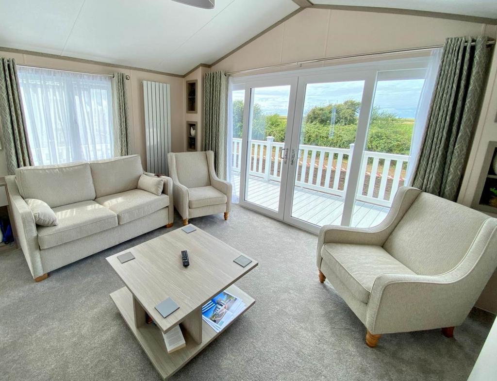 Open plan lounge-kitchen-diner with 6-seater dining set, sofa-bed, 2 x armchairs, coffee table, sliding patio doors and feature fireplace.