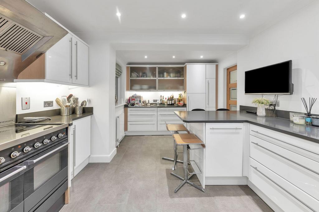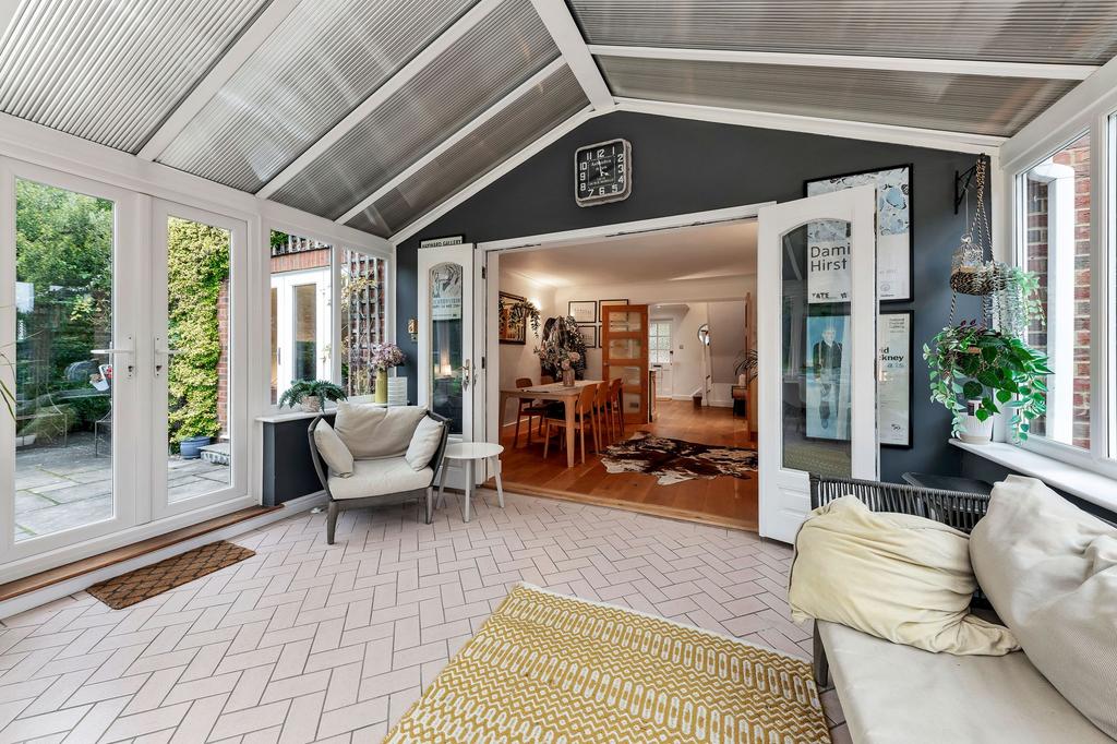 The dining room is spacious and bright, boasting an open-plan atmosphere with the entrance hallway and conservatory, and providing a lovely formal space for families to enjoy meals. It has attractive wood flooring, sconce lighting and space for a large dining setting and storage furniture. Via double French doors, the conservatory is another beautiful and versatile reception space, with panoramic views of the garden, tiled flooring, a fan light and space for furniture. The lounge is open, bright and fantastically sized, with windows and double French doors to a dual aspect, a feature fireplace, wood flooring, pendant lighting, integrated storage and shelving, and plenty of space for lounge and storage furniture.