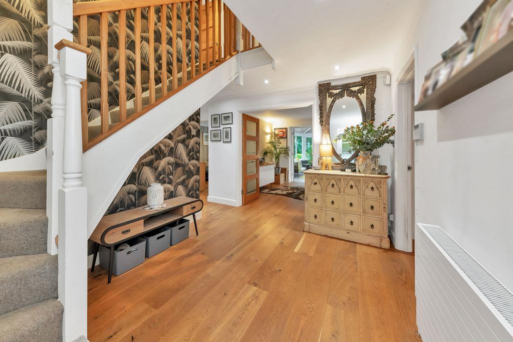 This beautifully maintained detached property enjoys excellent kerb appeal, with front gardens of mature trees and hedgerows, and access to a double garage with parking. Upon stepping inside, the entrance hallway is grand, spacious and beautifully decorated, alluding to the high standard seen throughout. There is attractive wood flooring, inset lighting, vast amounts of space for furniture, stairs to the first floor, and access through to the downstairs living space, including a cloakroom WC and a large snug, which makes an ideal home office.