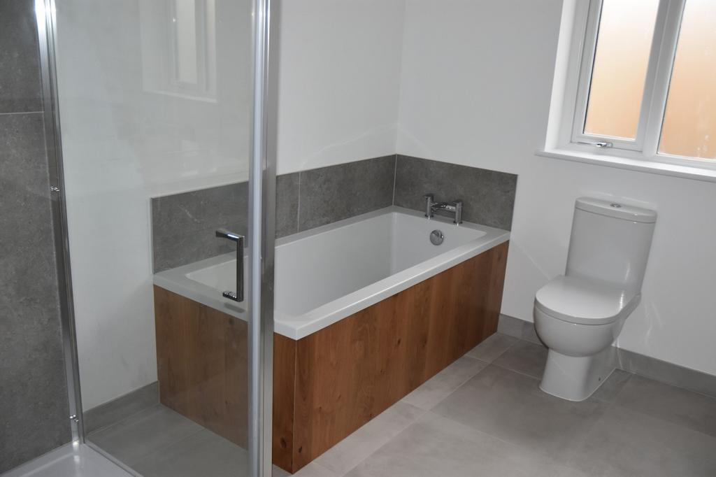 FAMILY BATHROOM 9’ 9” x 8’ 5”. Window overlooking the side of the property. Bath with tiled splashback. Fully tiled separate shower cubicle. WC. Large vanity unit with cupboards, drawers & monobloc style tap with large mirror above. Heated towel rail. Extractor fan. Downlighters. Ceramic tiled floor continued from hallway.
