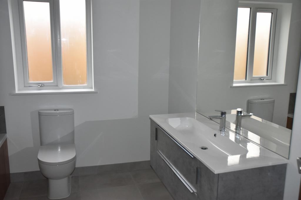 EN-SUITE 11’ x 3’ 10”. Window to the rear of the property. Fully tiled double shower cubicle. Vanity unit with drawers and large mirror above & monobloc style tap. WC. Heated towel rail. Extractor fan. Downlighters. Ceramic tiled floor.