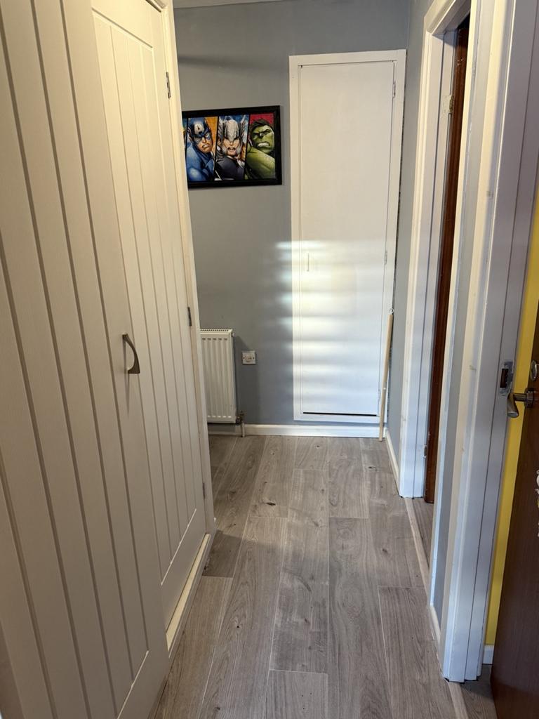 Laminate flooring. Storage cupboard with double doors. Linen cupboard. Loft access hatch with Ramsay Ladder—partially floored loft with power and light.