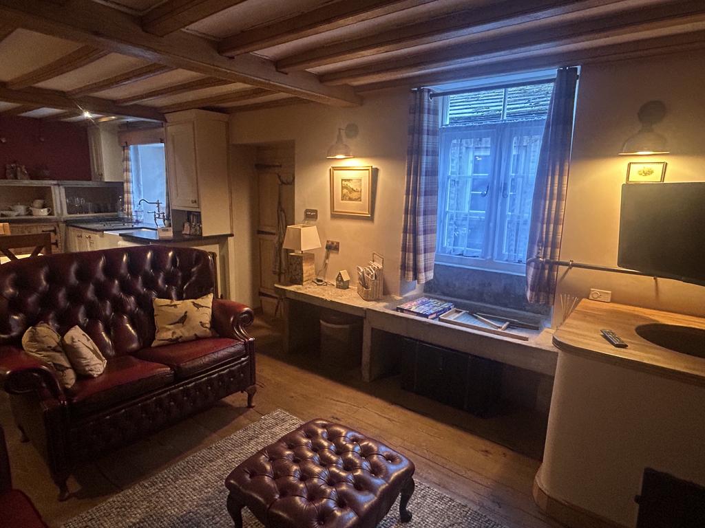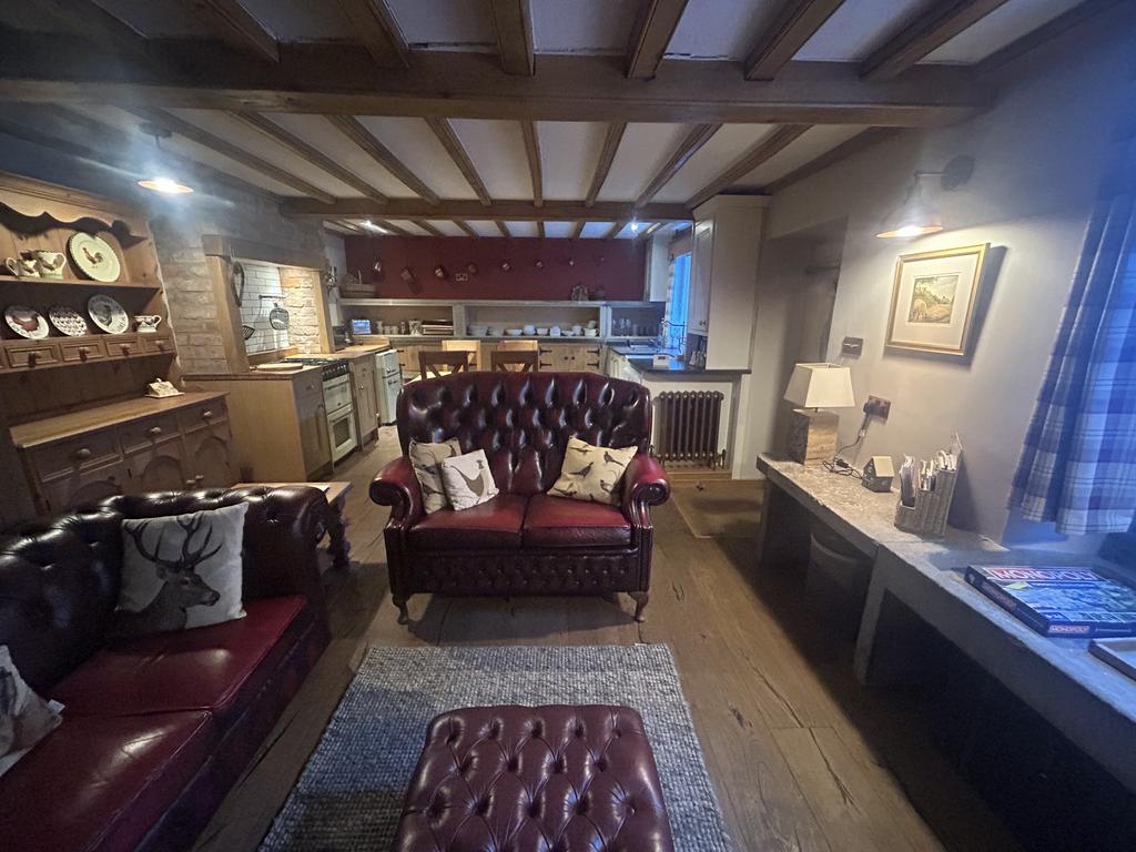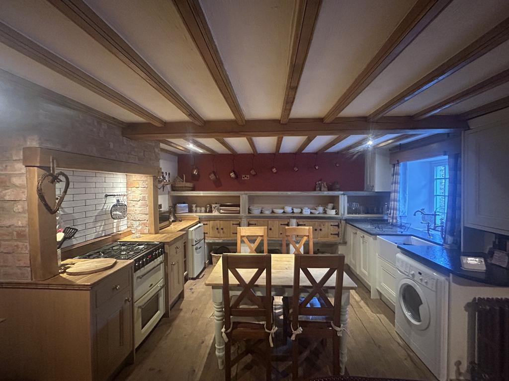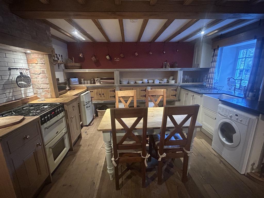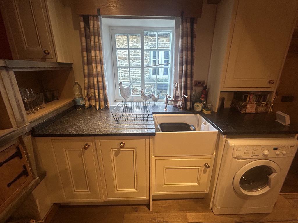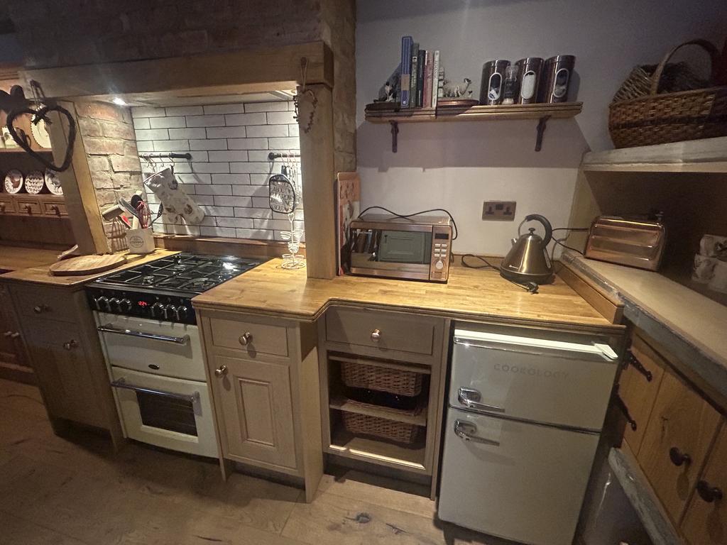 To the right of the entrance door is a cast iron radiator. Cream base unit with Belfast sink set in a black granite worktop. On the end wall of the kitchen there are three original stone shelves with fitted cupboards below and storage areas under. There is a further range of timber base units with solid wood worktops, a Belling electric double oven and a 4 ring gas hob above with extractor over. There is a tiled splashback behind the cooker and 2 small rails for kitchen tools. There is a beamed ceiling in kitchen through to the living room. Heat alarm on ceiling. Plumbed for a washing machine and Cookology fridge/freezer has been left for the tenant’s use but will not be replaced/repaired if it stops working.