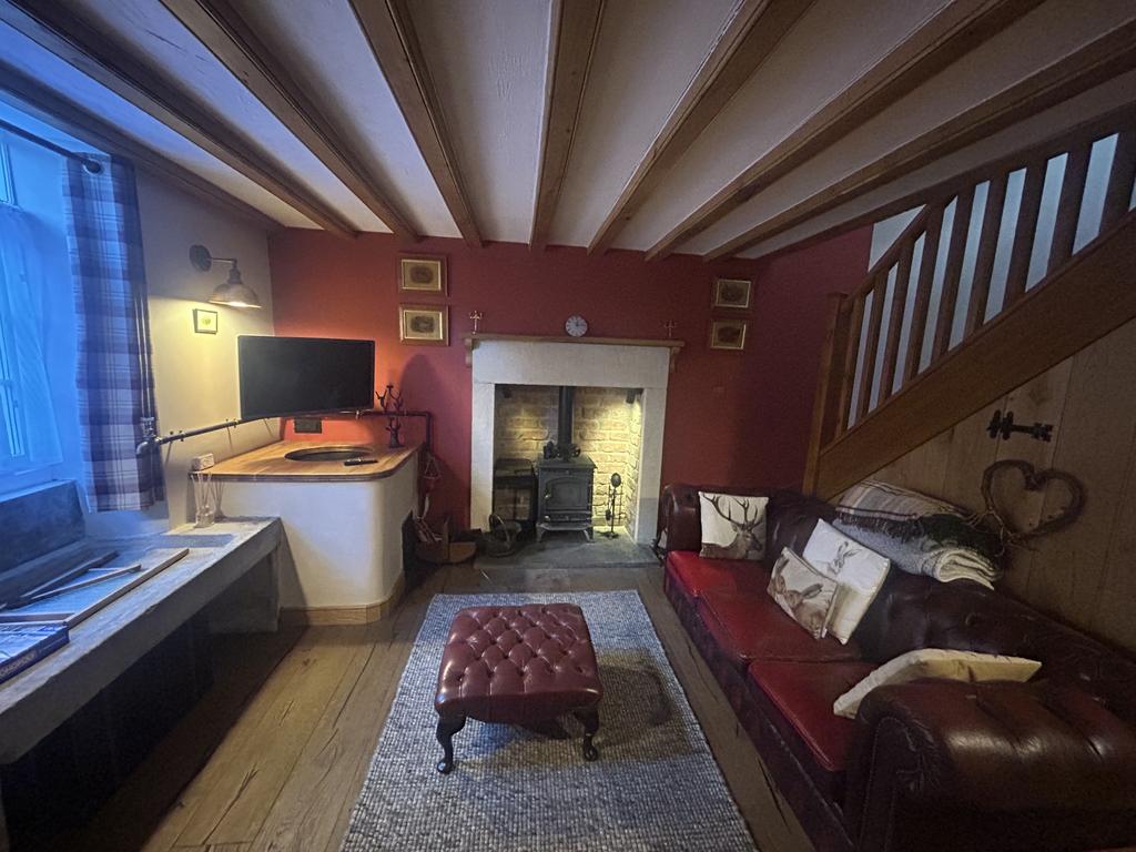 Original stone shelf and stone sink has been left as a feature with storage area under. (These were the shelves that held the cheese). To the right of the shelves is the cheese making vat which has been made into a feature with a wooden lid. TV point, carbon monoxide alarm, 2 wall lights with copper shades, understairs cupboard. Multi-fuel stove recessed with stone surround and red bricks behind stove in recess. Timber mantlepiece over stone surround and stove is set on a stone hearth.