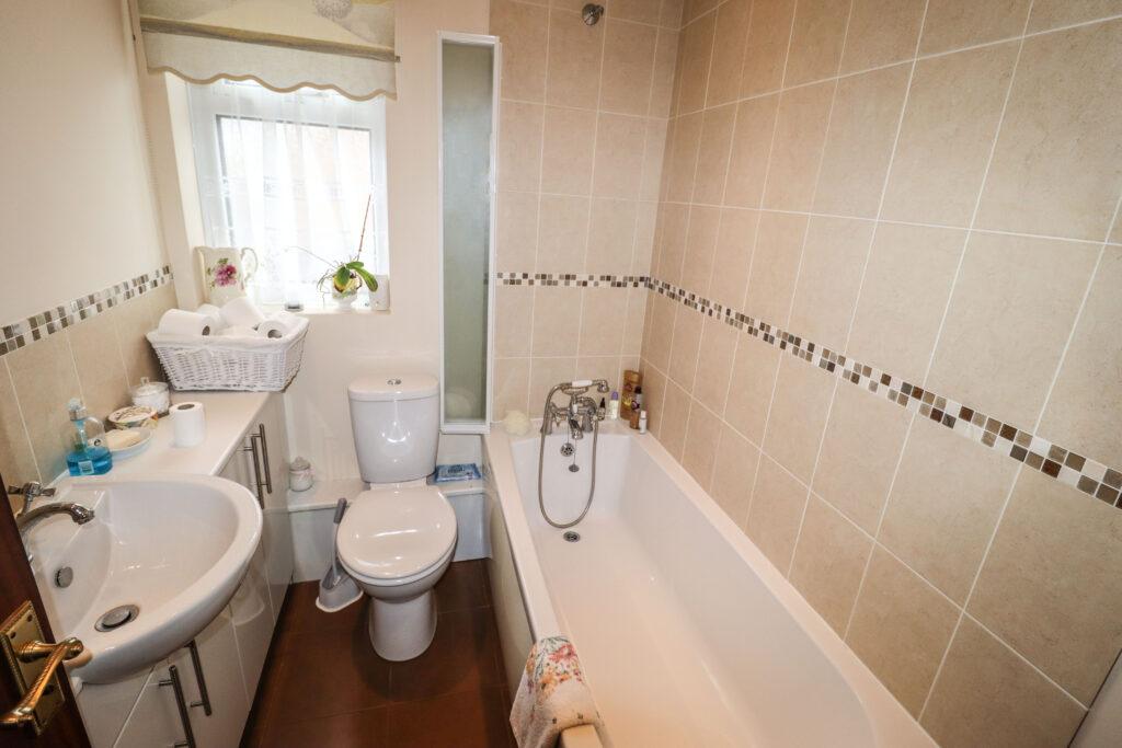 Fitted with an attractive white suite. Low level WC. Feature vanity wash hand basin with mixer taps, splashback tiles and cupboards under. Panelled bath with telephone style mixer taps and a hand shower. Side screen. Walls fully tiled to the bath area. Ceramic tiled floor. Chrome heated towel rail / radiator. Four inset ceiling spotlights. South facing UPVC double glazed window with obscured glass to the side. Fitted mirror.