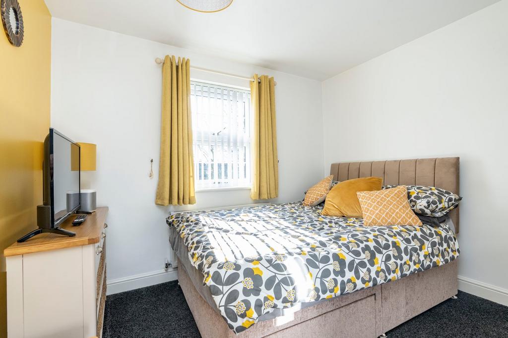 Having two double glazed windows to front aspect, built-in over stairs cupboard, fitted wardrobes, TV aerial point, two radiators, door to: -