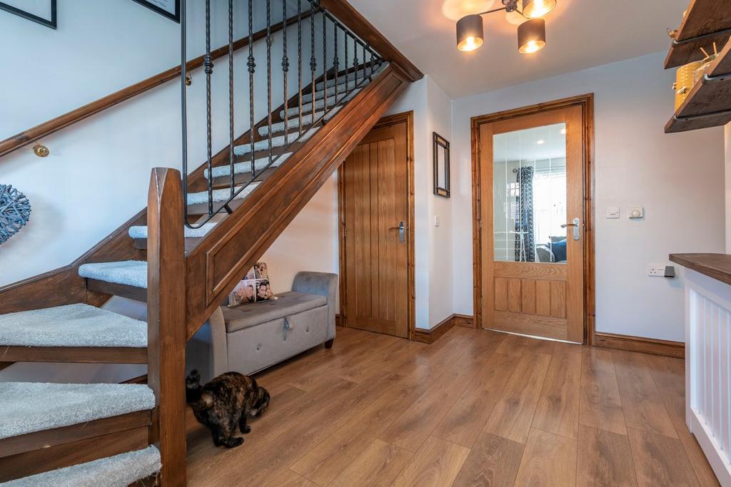 With wood laminate flooring, radiator, staircase rising to first floor landing, under stairs storage, additional storage cupboard.