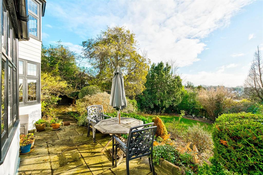 Set back from the road behind high hedges, the house enjoys a great deal of seclusion, with two parking spaces to the front. The grounds wrap around the property, with deep boundaries on all sides and a large sunken lawn accessed from the barn door on the raised patio area. The large lower lawn enjoys a great sense of privacy, with established trees and shrubs lining the boundary, whilst outstanding views, as far reaching as Canary Wharf, can be enjoyed from the home and raised patio that lies immediately outside it.