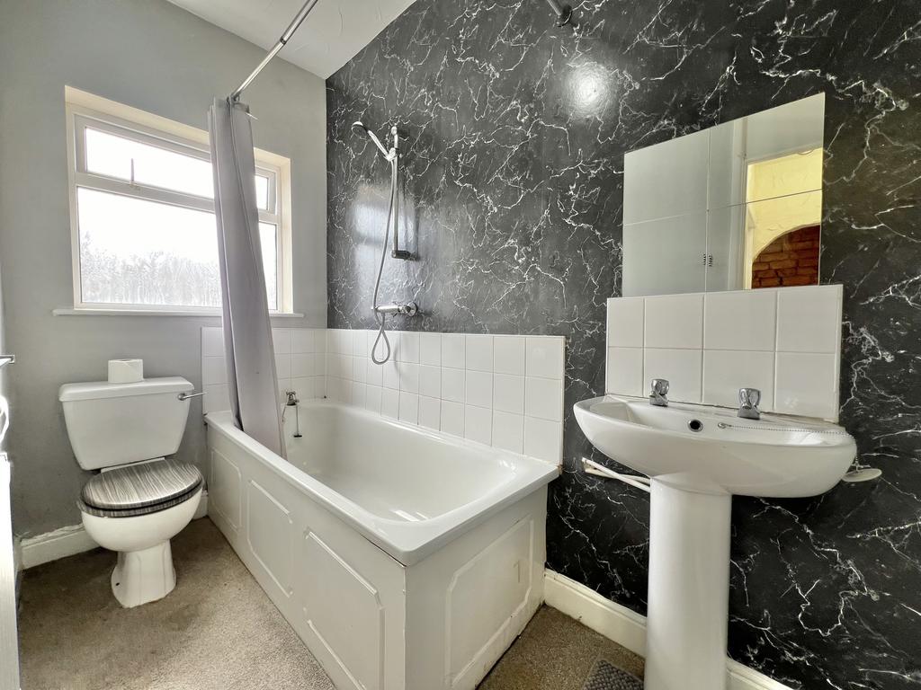 UPVC double glazed opaque window to the rear aspect, fitted three piece suite comprising; panelled bath with shower over head, low flush wc, wash hand basin and radiator.