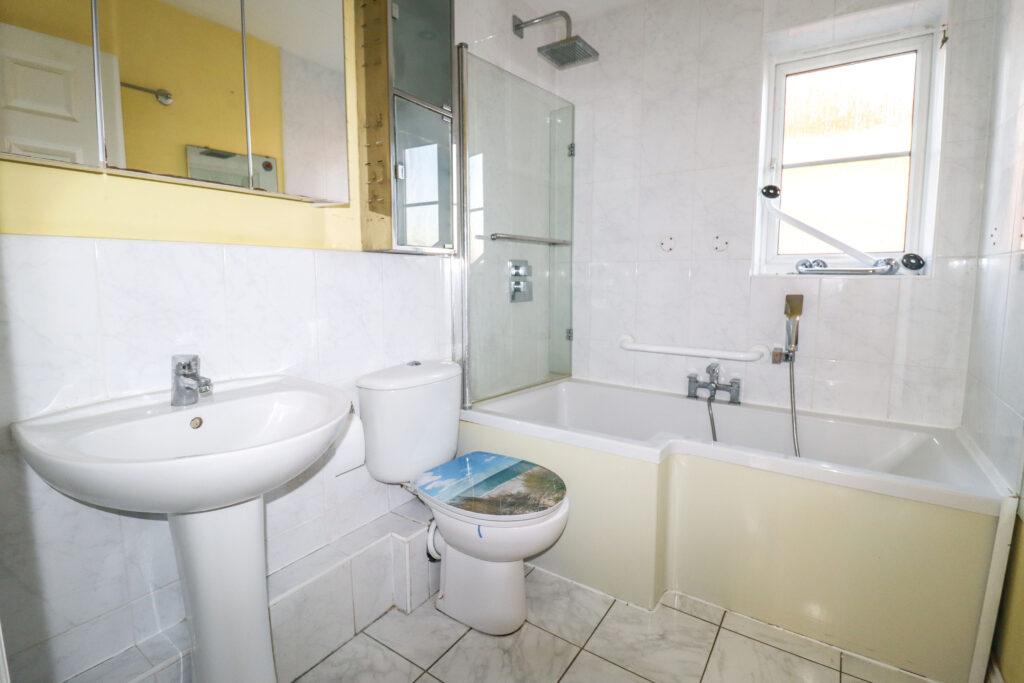 Fitted with an attractive white suite. Low level WC. Pedestal wash hand basin with mixer taps and splashback tiles. Radiator. Walls half tiled. Extractor. Laminated wood flooring. Recessed shelving.