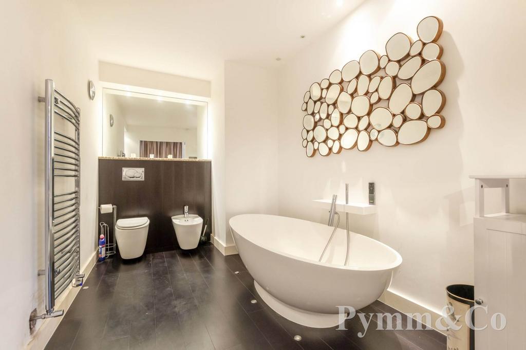 Stunning freestanding oval bath with mixer tap and shower attachment, wash basin set onto feature pebble and resin shelf, low level WC and bidet, ceiling spotlights and sunken floor spotlights, integrated sunken TV/radio unit, extractor fan, chrome heated towel radiator.