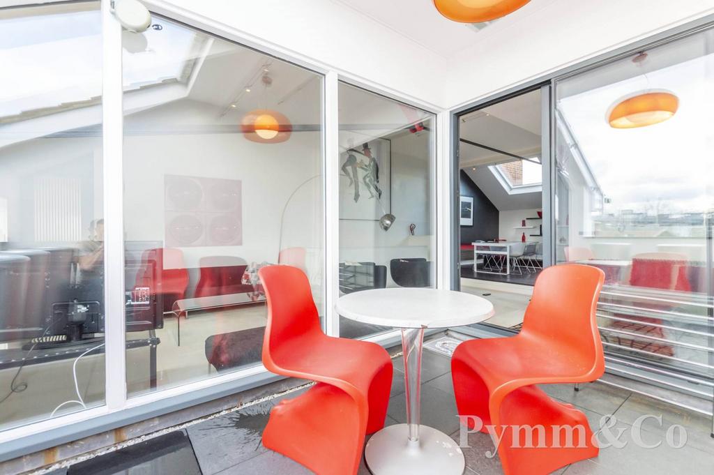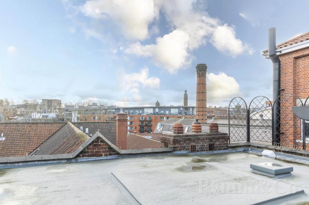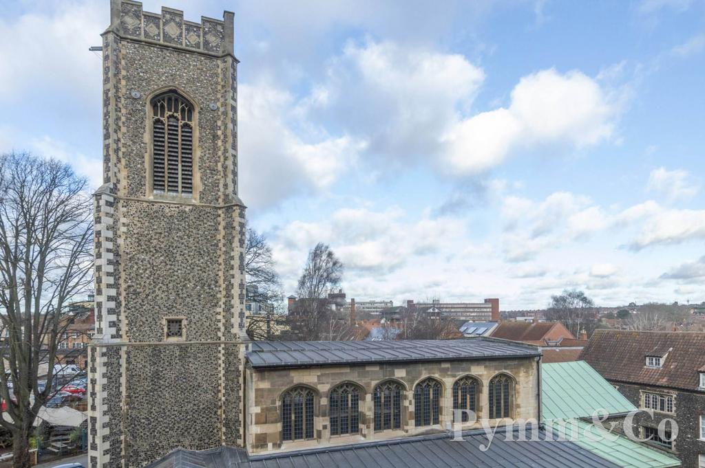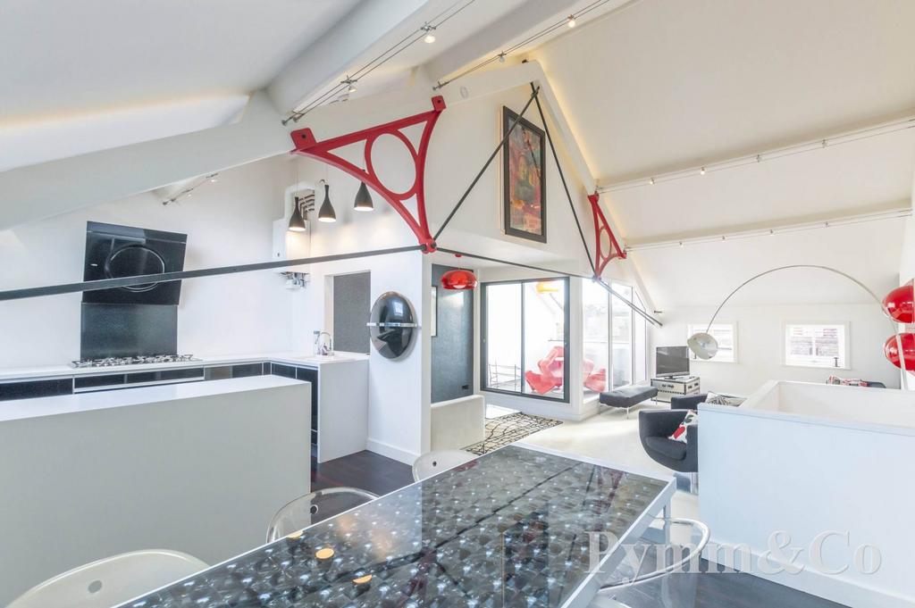 This stunning former show apartment offers exceptional living accommodation spread over two spacious floors totalling 1392 sq.ft. The entrance features a lift and staircase leading to a private hallway, setting the tone for the elegance within. The first floor boasts a magnificent principal bedroom with a large en-suite and breathtaking views over St George Colegate Church, alongside a second well appointed bedroom and an additional bathroom. The upper floor is entirely dedicated to an impressive living area with a vaulted ceiling, providing a sense of openness and grandeur. From here, you can step out onto a slightly recessed roof terrace, perfect for entertaining while enjoying panoramic views of the Cathedral City of Norwich. A step up from the living area leads to a spectacular kitchen and breakfast room, also featuring a vaulted ceiling and ample space for a large dining table. The quality fitted kitchen is equipped with Corian work surfaces, Miele appliances, and a six burner Smeg hob, making it a chef's dream. The apartment benefits from gas central heating and showcases thoughtful design throughout, combining luxury with comfort in an enviable City centre location.
