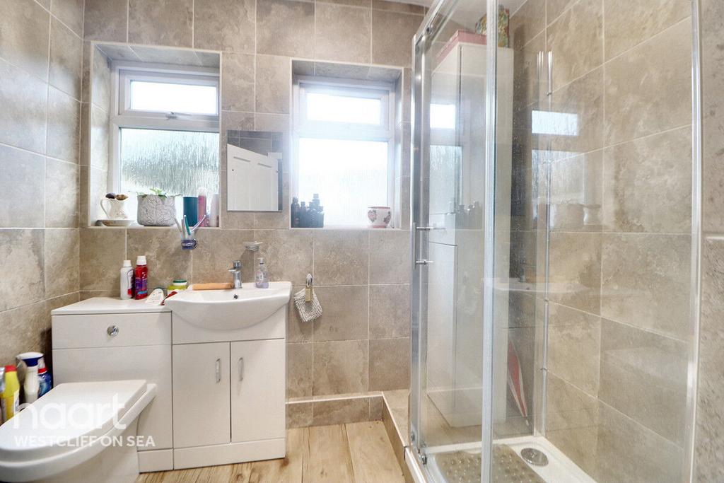 Three piece suite comprising of low level WC, vanity unit wash hand basin with mixer tap, walk in shower, tiled walls, double glazed obscure window to rear.