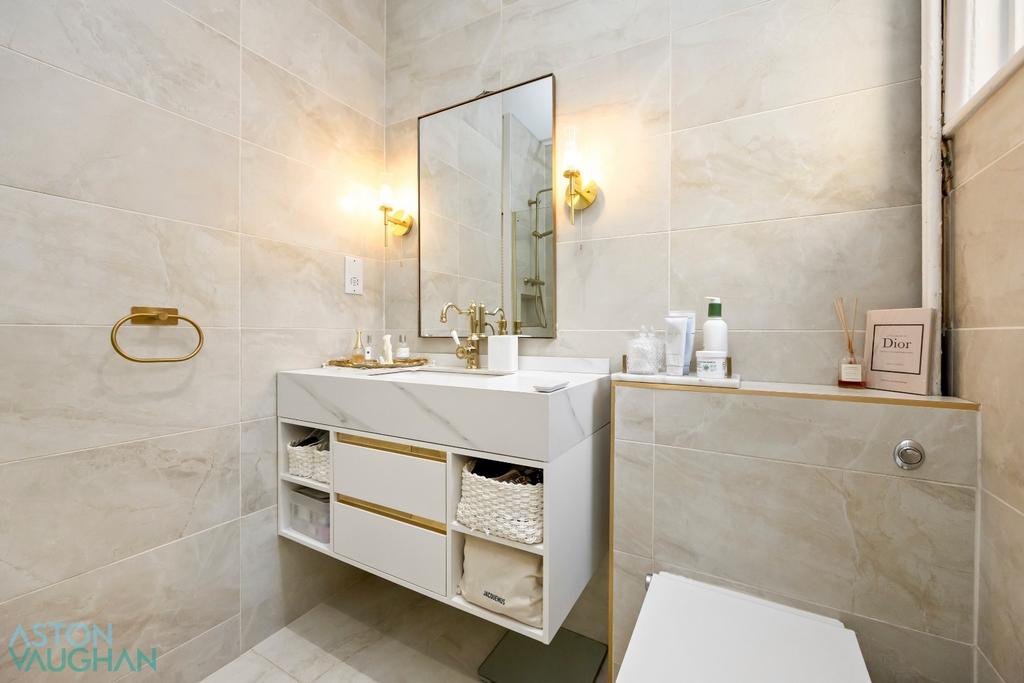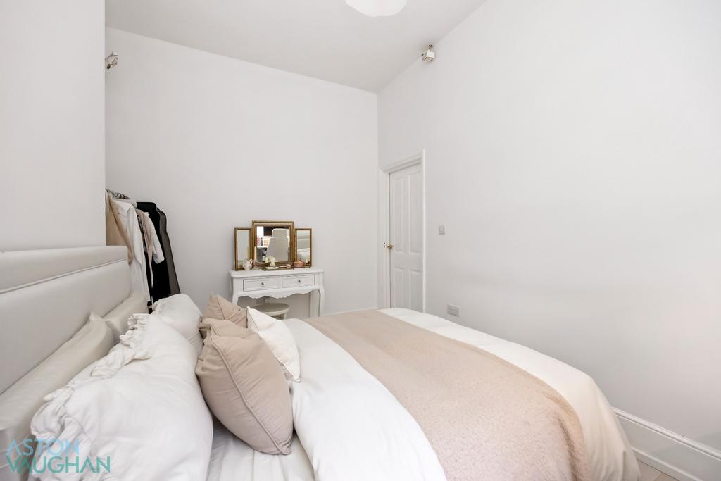 Moving through the flat, the bathroom has been recently renovated with floor to ceiling stone tiles and a contemporary walk-in shower cubicle with brushed gold fittings and a rainfall showerhead. Nearby, the bedroom is a cosy double room with a high ceiling and space for several pieces of freestanding bedroom furnishings within the alcoves.