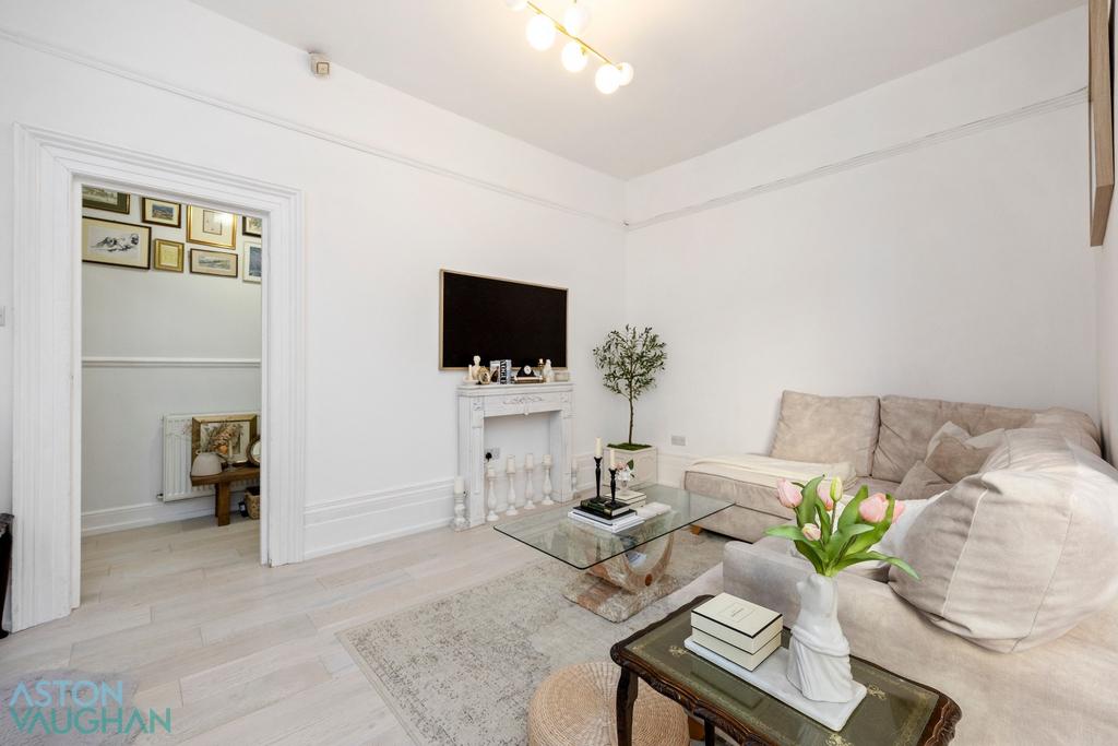 Entering a long and well-lit corridor, limed oak floorboards and soft white walls greet you. This fresh, neutral palette continues throughout the flat, brightening each room, pairing well with all styles of furnishing. First to the left, the living room is partially open plan to the kitchen which sits nicely tucked away. There is ample space for relaxation and formal dining below the tall sash window, alongside the kitchen where a peninsula island creates a second informal dining space with a breakfast bar to seat two. Cream Shaker cabinetry provides a wealth of storage alongside a butler sink and integrated appliances which sit below marble worktops.