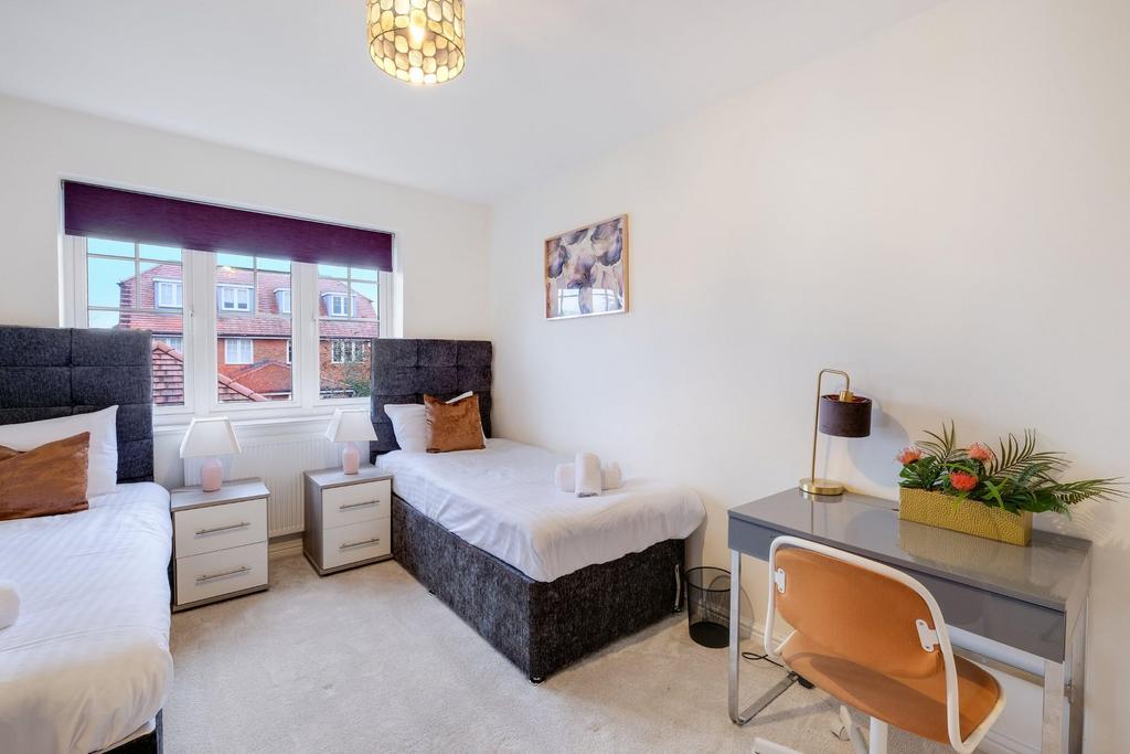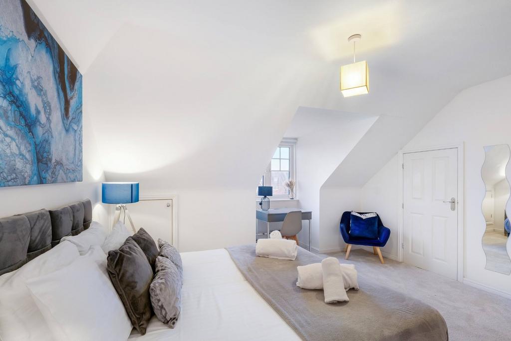 Welcome to this exquisite 4-bedroom, 3.5-bathroom home in Maidenhead, where every detail has been carefully designed to provide a comfortable stay. Perfect for families, corporate travellers, or groups, this property offers an inviting blend of elegance and modern convenience, ideal for short-term stays. Step inside and be greeted by a bright and welcoming hallway that flows seamlessly into the spacious living area. Illuminated by natural light pouring through large windows, the living space features plush seating. The perfect setting to unwind after a day of exploration or work. Each of the four beautifully appointed bedrooms is designed to be a haven of tranquillity. The master suite boasts a king-sized bed styled with premium linens and tasteful décor. The additional bedrooms are equally comfortable, with stylish furnishings, ample storage, and cosy beds to ensure a restful night's sleep. The home offers 3.5 well-equipped bathrooms, ensuring plenty of space and convenience for all guests. The heart of the home is the fully equipped modern kitchen, complete with high-end appliances and everything needed to prepare meals with ease. The separate dining area provides the perfect space to gather for shared meals or casual conversations. Outside, you'll find a private, beautifully landscaped garden. Whether you're sipping your morning coffee or simply soaking in the peaceful ambiance, the outdoor space is a delightful retreat from the bustle of everyday life. Additional amenities include off-street parking and high-speed internet ensuring both convenience and entertainment throughout your stay. This home's location in Maidenhead offers easy access to vib-rant local amenities, scenic attractions like the Thames Path and Windsor Castle. Excellent transport links make it easy to explore nearby towns or venture into London for the day. Whether you're visiting for business or leisure, this Maidenhead retreat promises an unforgettable experience, combining contemporary elegance with the warmth of a true home away from home.