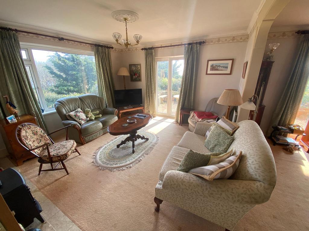 The lounge/diner has a door at the lounge end through to the kitchen, a stone feature fireplace wall with grate and a door out to the side terrace and a window to the rear, both with sea views. The dining end also has a door out to the side terrace with sea views and a window to the front.