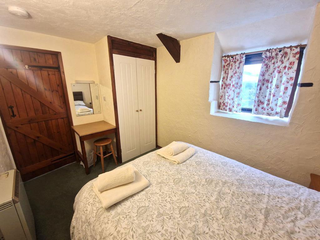 A twin room, with front aspect window, exposed beams, built in wardrobe, dressing table area with wall mounted mirror and light, carpeted flooring and electric night storage heater.