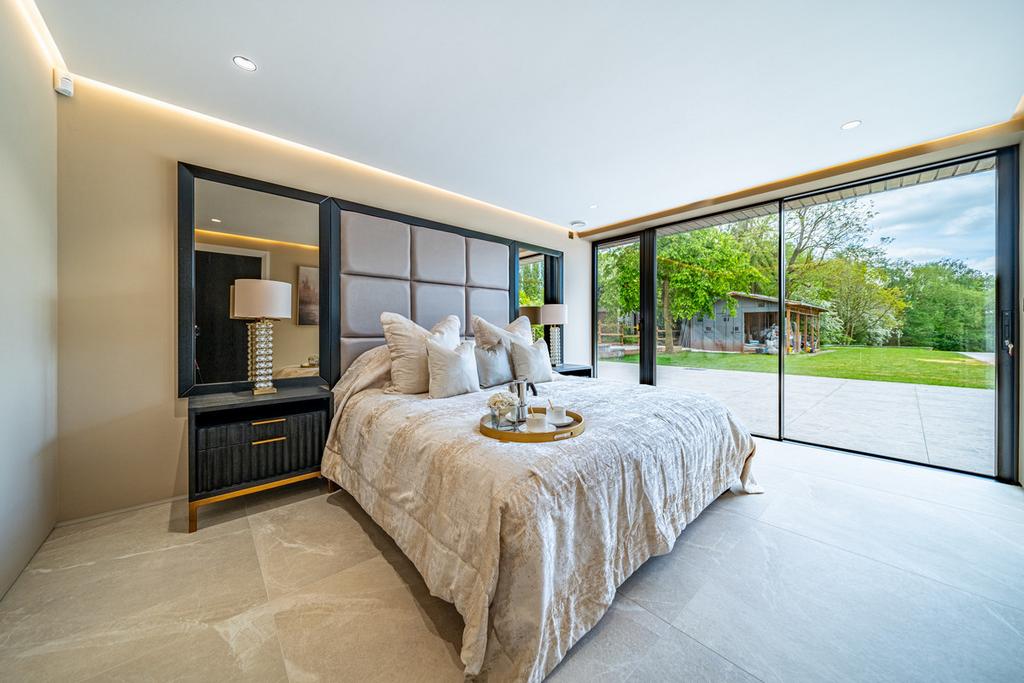 The principal suite features a glazed wall with sliding door access to the garden, flooding the room with light, a large dressing room and a luxurious ensuite. Featuring smart privacy glass, a large Roca smart shower and a freestanding bath, this luxurious ensuite ensures privacy whilst also giving the owners the opportunity to enjoy the views over their private rear garden.
