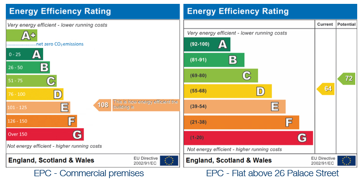 - EPC Rating: Commerical premises: 108 E / Flat above: 64 D