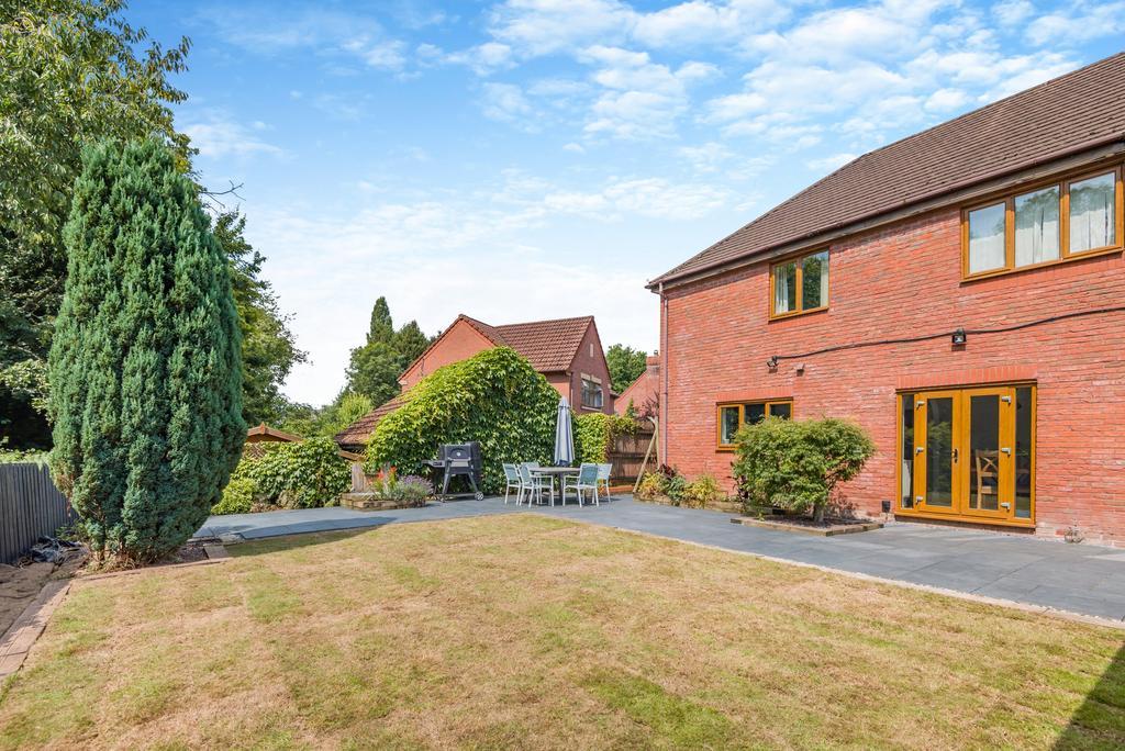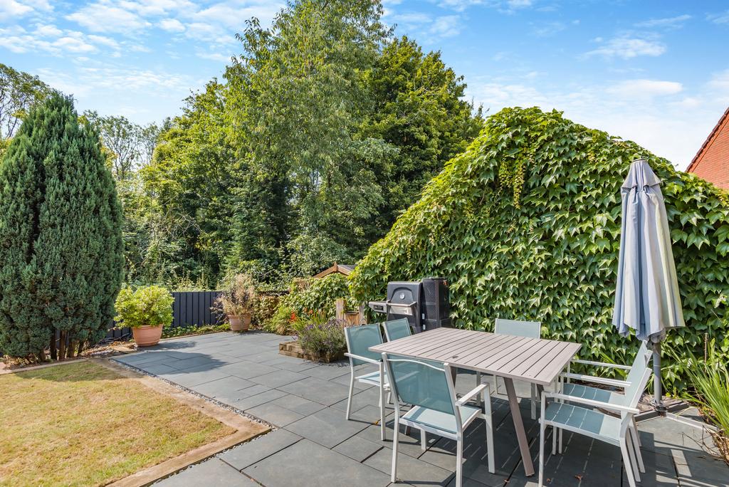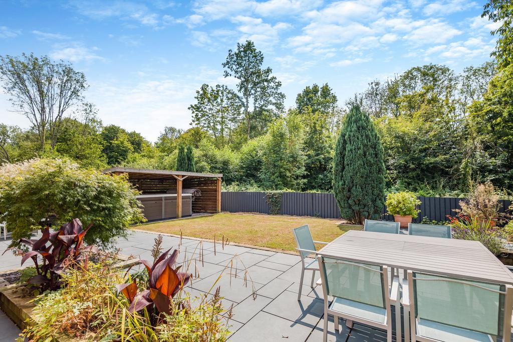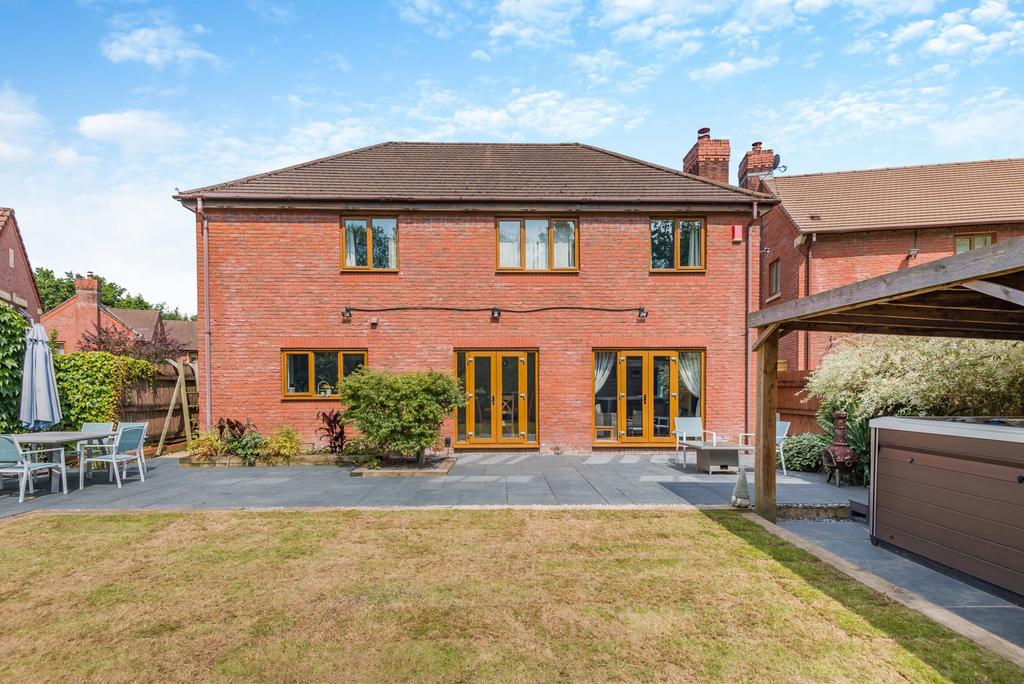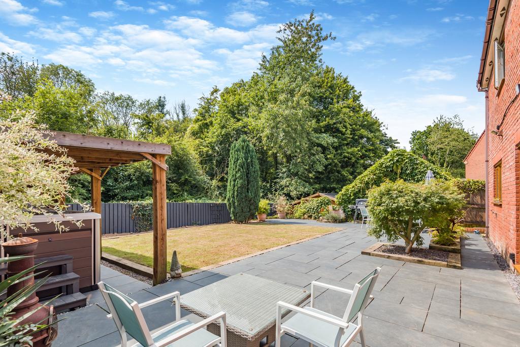 The property has lots of kerb appeal, built in a mid-century architectural style with a number of period-influenced features including leaded bay windows and a gable end faced with decorative tiling. A brick paved front driveway provides off-road parking for two vehicles in front of an integral double garage. The level, landscaped rear gardens comprise a large paved area for outdoor relaxing and entertaining, a recently re-turfed natural lawn and a dark wood pergola housing a swim spa hot tub and an ornamental water feature.