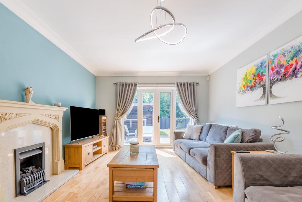 The living room is situated adjacent to the dining area and also has double glazed French doors to the rear patio. It is a spacious and elegant reception room, with a coved ceiling, an arched window to one side and a feature fireplace housing a gas fire.