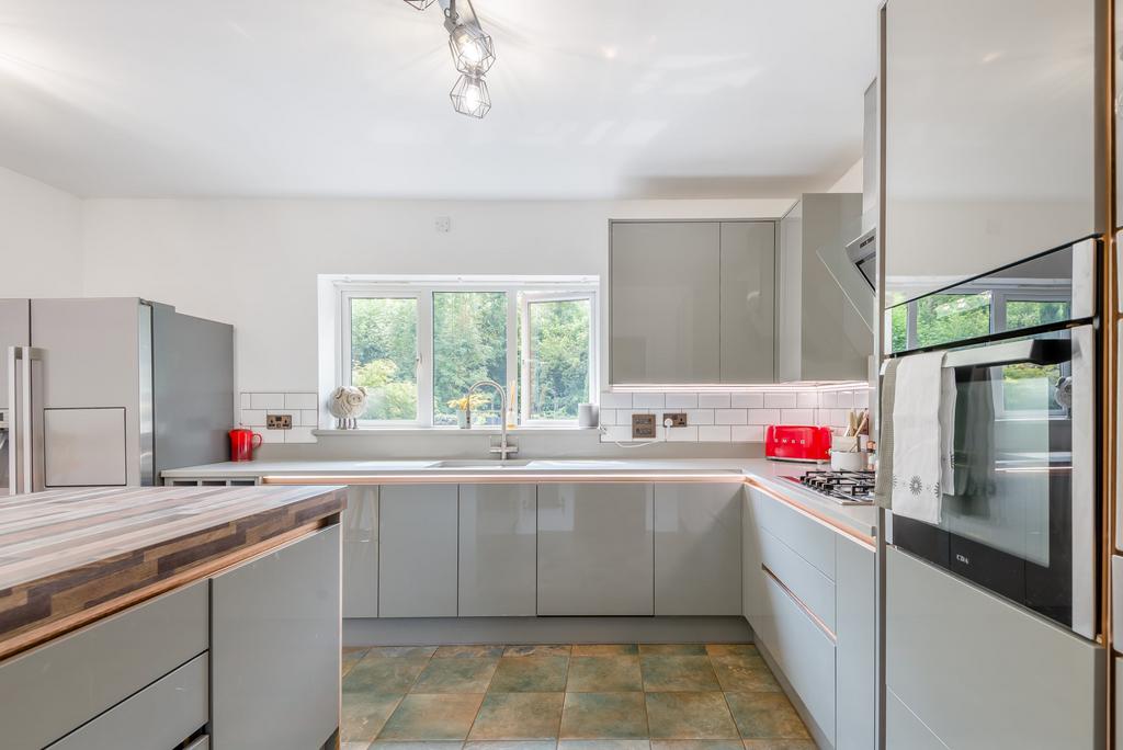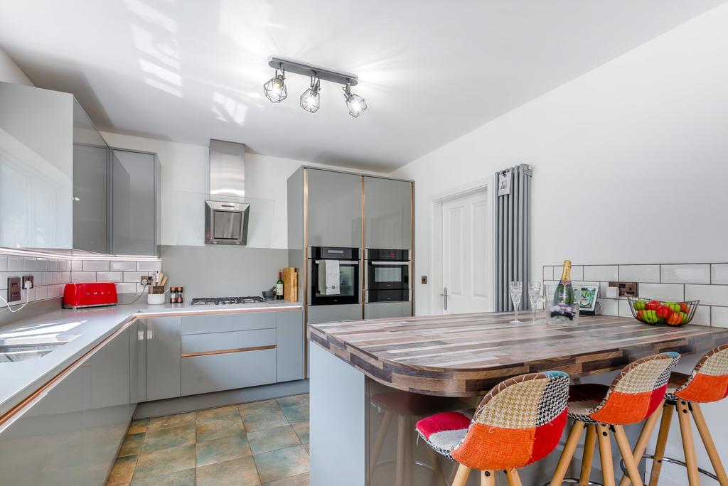 The heart of this family home is the spacious, open plan kitchen/dining room, which is located at the rear of the property, overlooking the well-maintained, enclosed gardens. The sleek, contemporary-style kitchen has been recently fitted with attractive grey high gloss units and incorporates a selection of integrated appliances, whilst there is also ample space for a freestanding fridge freezer. A large central island doubles up as a breakfast bar. Off the kitchen there is a useful utility room with space and plumbing for a washing machine and tumble dryer.