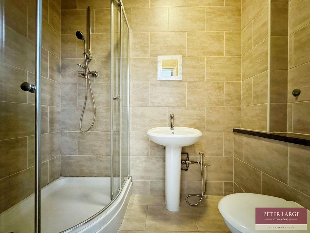Having a ceramic tiled floor, fully tiled walls, built-in shower cubicle with mains shower over, low flush WC with concealed cistern, pedestal wash hand basin, extractor and stainless steel towel rail incorporating radiator.
