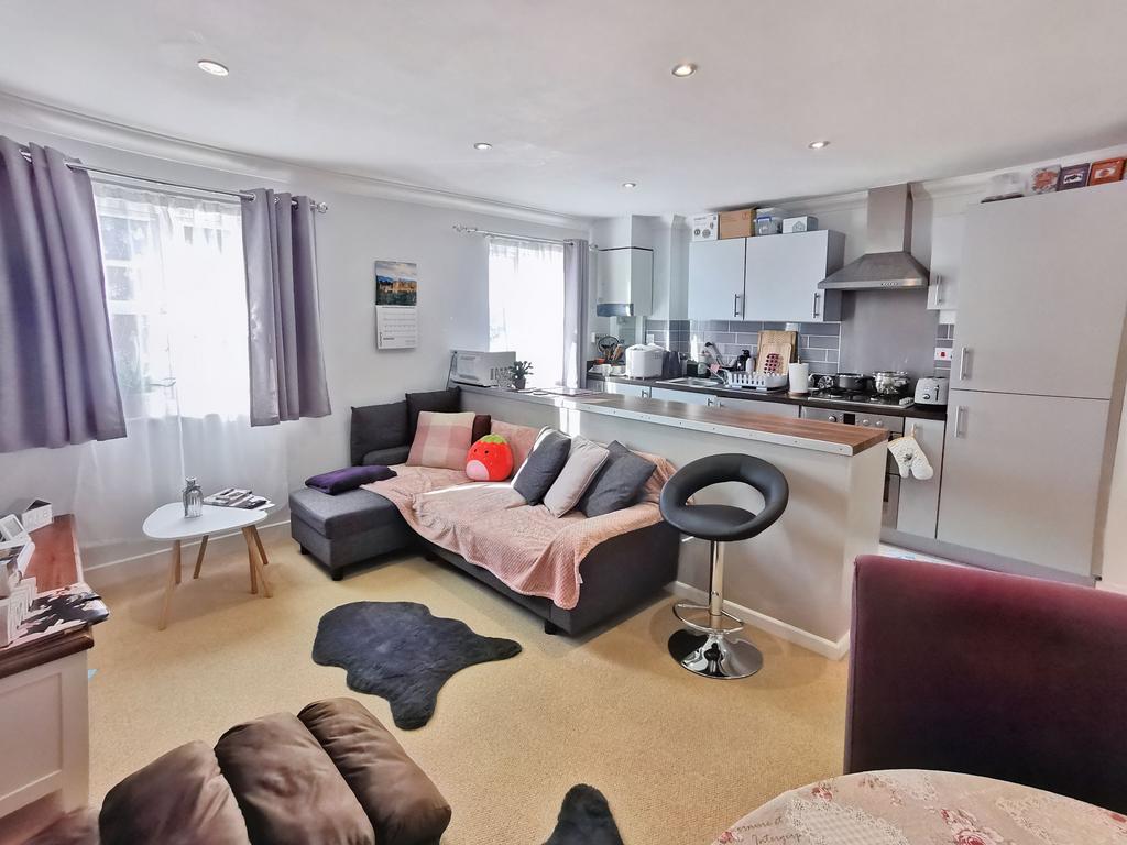 Open plan living area, double glazed windows to the side, kitchen area with breakfast bar and fitted appliances including gas hob and oven.