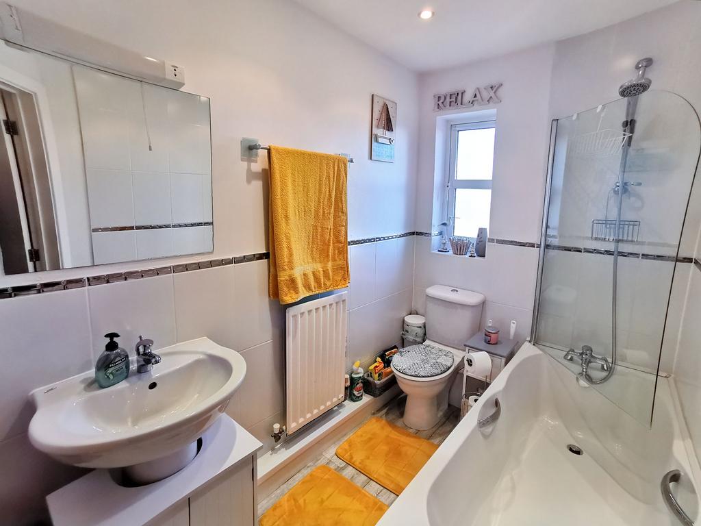 Double glazed window to rear, panel bath with shower over, low level wc and wash hand basin