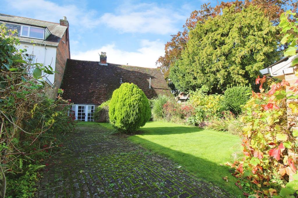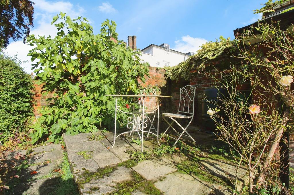 The rear garden is enclosed by walls and includes a patio area, a raised terrace seating area, and a level lawn bordered by mature plants and hedging, with views of Marlborough's historic buildings and rooftops. A brick-built shed provides additional storage, and there is access to the rear of the property via gates, where there is enough space to park two cars on a brick-paved area