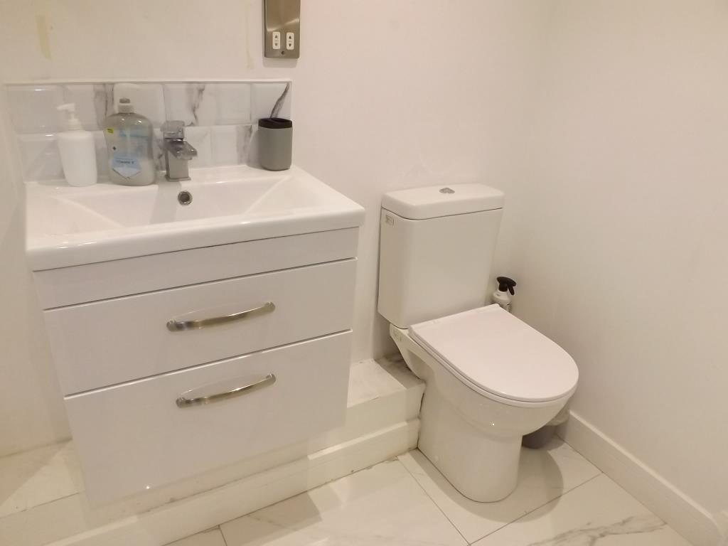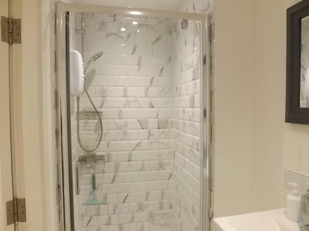 A Modern Living Room with sofa or Sofa-bed, a Smart TV and furniture along with a bathroom suite with cubicle shower, WC and built in basin unit with storage.