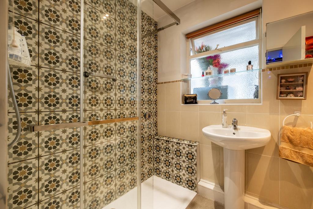 Obscured glazed windows. Three piece white suite, comprising: step-in double shower enclosure with sliding glass screen door and wall mounted Triton electric shower; pedestal wash hand basin with mixer tap; and WC. Spot lighting, extractor fan, part tiled walls, carpeted walls and radiator.