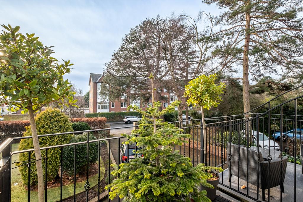 Fantastic sunny south facing balcony with wrought iron balustrade and timber floor, overlooking the landscaped gardens, with distant sea views.
