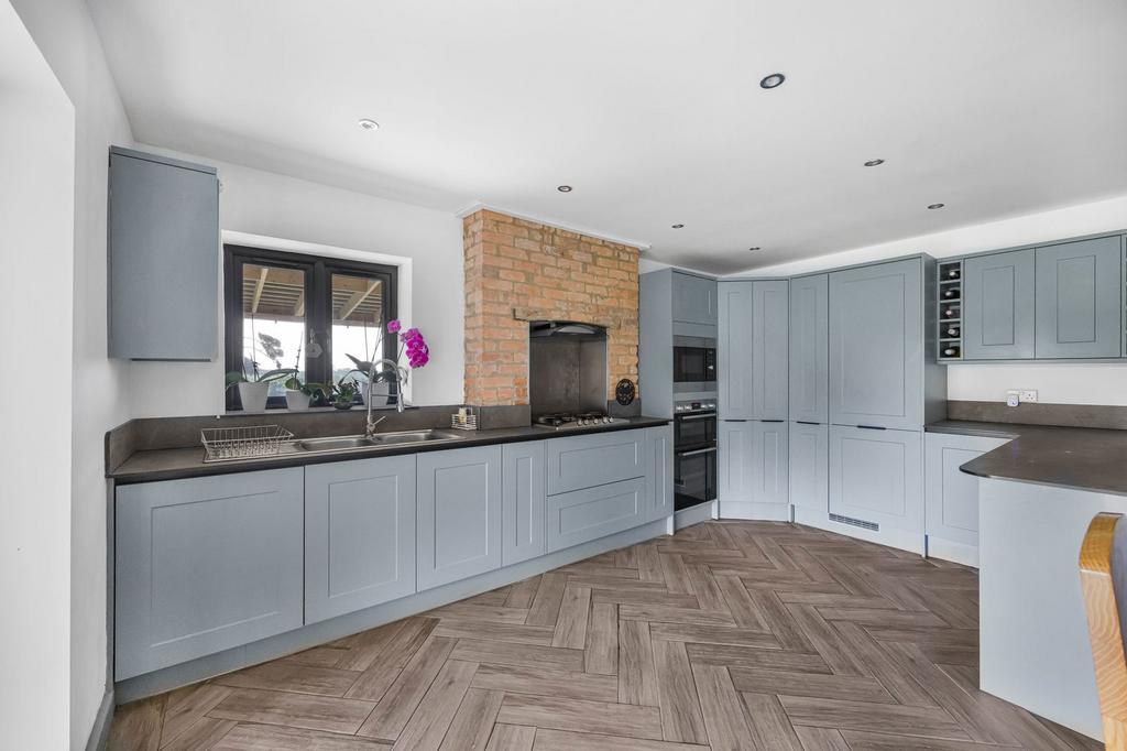 Kitchen/lounge room. 9.5m x 5m family room incorporating a new fully loaded luxury kitchen area with double oven, dishwasher, integrated microwave and fridge freezer, double sink with window above, walk in pantry, gas hob and extractor fan, wine rack etc. There is a large breakfast bar, space for a dining table that leads to a lounge area. There is a wood burner in a feature fireplace that also works as a boiler, this area has under floor heating and ceramic tile floor and incorporates two huge bifold doors to take in the views and outside to sitting/dining area, stairs leading up to landing area.