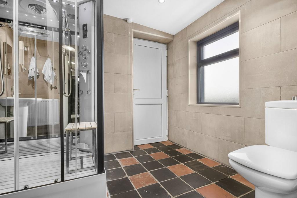 Downstairs wc/shower room. 2.8m x 2.10m close coupled wc ,wash hand basin and luxury double shower cabinet that is also a steamer unit with DAB radio and led lighting, quarry tiled floor, over basin cabinet and double radiator with door leading externally to pool/patio area.