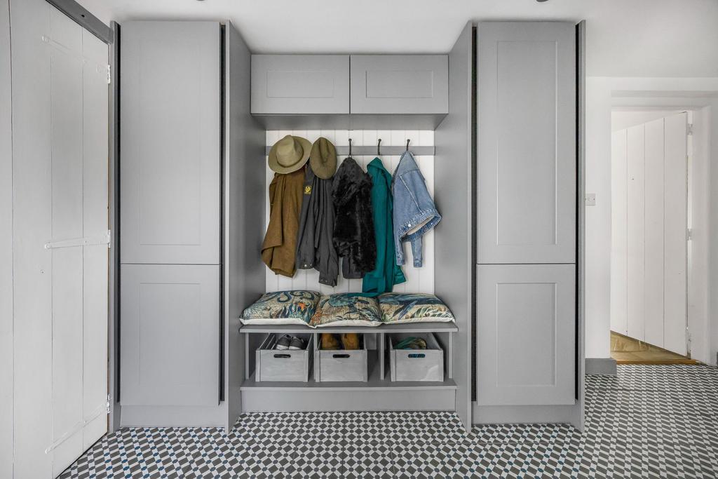 Boot room/rear entrance. 8.5m x 2.6m. French doors leads into coat hanging area with purpose made cupboards, storage space and hangers for coats, boots etc.