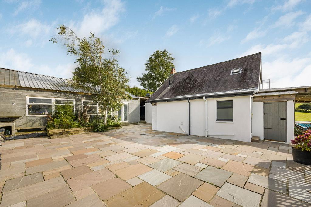 Patio/Bbq area. 10m x 10m- private south facing with small herb garden and water feature with sandstone slabs with views over the valley.