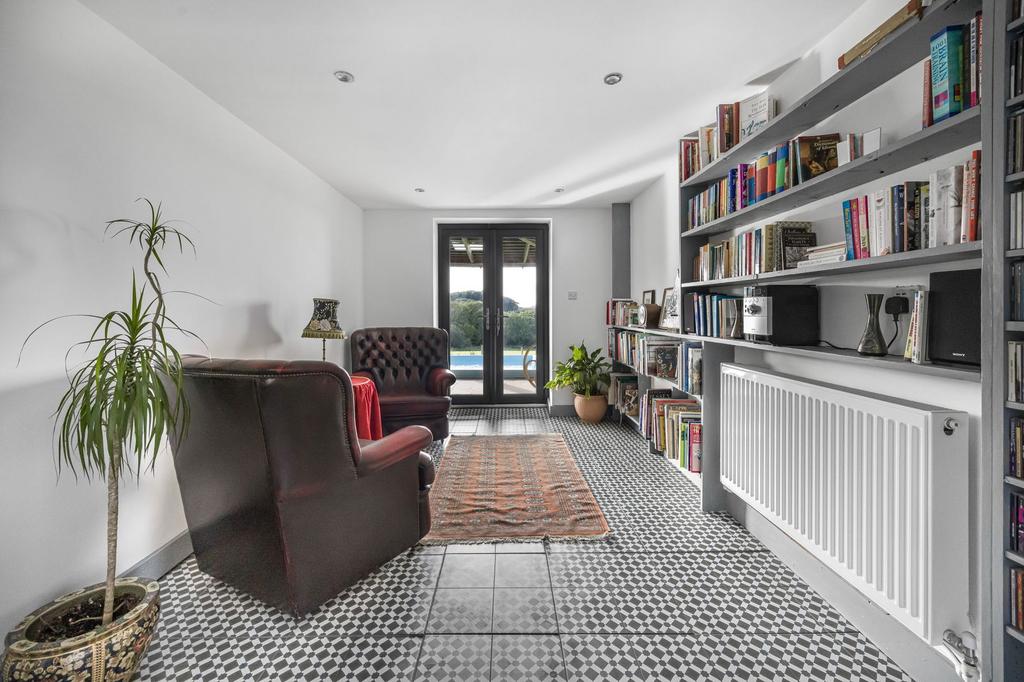 This room has a ceramic tile floor and leads to smaller lounge area with bookshelves and seating area with double French doors opening out to the pool terrace.two double radiators and 3 electrical sockets, door into utility room.