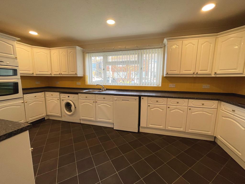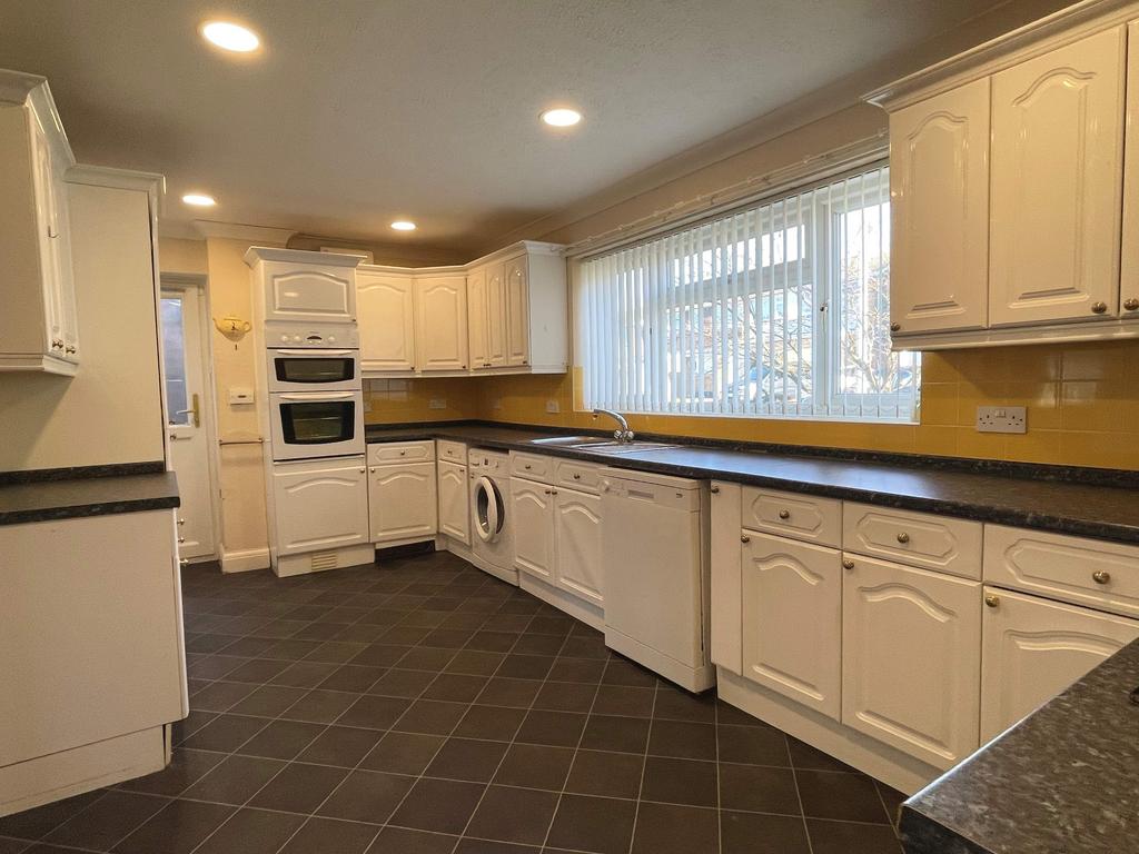 Range of wall and base units. modern contoured work surfaces. One and half bowl, Stainless steel sink, drainer and tap. Four ring hob, with extractor above. Electrolux double oven. Built in fridge freezer. Space and pint for a washing machine. Space and point for a dishwasher. Door to the side. Radiator. Double glazed window to the front. Tiled splashbacks. Opening to;