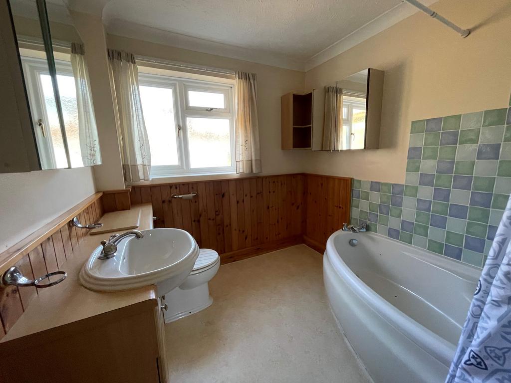 Inset bath with central taps. Low level flush WC. Separate shower cubicle. Pedestal wash hand basin. Range of storage cupboards. Partly tiled walls. Velux window, offering far reaching Downland views.