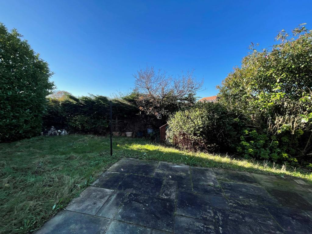Westerly facing rear garden, with paved patio area. Lawn and mature shrubs.