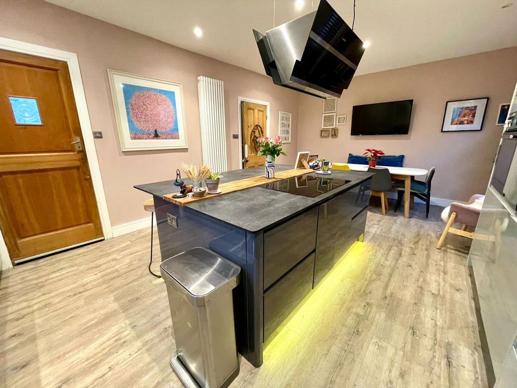 A spacious and impressive room, perfect for socialising. Enjoying a modern range of wall, base and drawer units with work surface over, central island/breakfast bar with under unit lighting, cupboards below and inset electric hob with feature extractor hood over, inset sink and drainer unit, upvc window to rear and side elevations, cupboard enclosing Baxi central heating boiler, plumbing for dish washer, two separate built in electric ovens, integral base level fridge, radiator, inset ceiling spotlights, door leading to