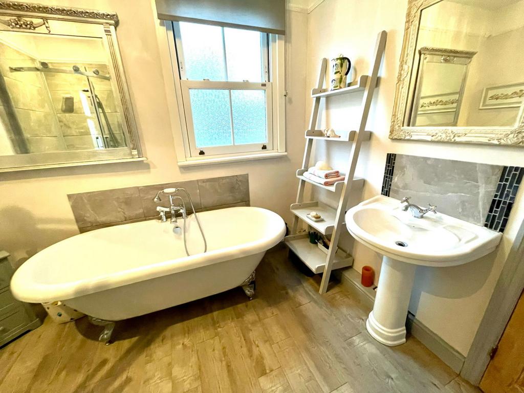 Free standing claw foot bath with central taps, corner shower unit with glass surround, wash hand basin, heated towel rail, built in storage cupboard, sash upvc window to rear elevation, access to loft space.