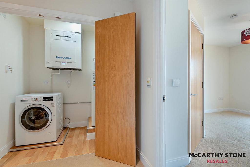 Hallway - Front door with spy hole leads to the large entrance hall - the 24-hour Tunstall emergency response pull cord system is situated in the hall. From the hallway there is a door to a walk-in storage cupboard/airing cupboard housing the BOSCH Washer/Dryer. Illuminated light switches, smoke detector, apartment security door entry system with intercom and emergency pull cord located in the hall. Doors lead to the kitchen, bedrooms, living room and bathroom.