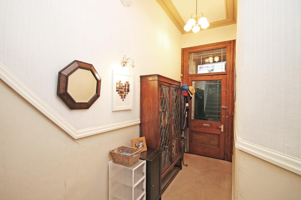 Spacious entrance porch with large feature front door, original floor tiles and glazed internal door through to the hallway.