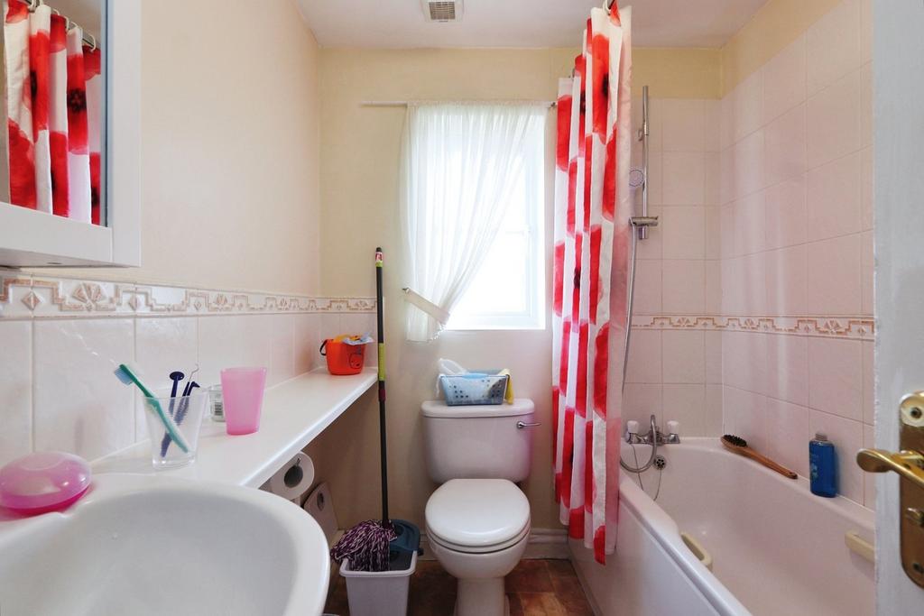 Bathroom - Comprising a low-level WC, a wash hand basin set into a vanity unit with a long worktop and a mirrored cabinet above, a panelled bath with an overhead mains shower, a frosted rear aspect double glazed window, tiled effect flooring, tiled splashbacks and a radiator.